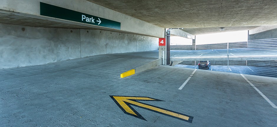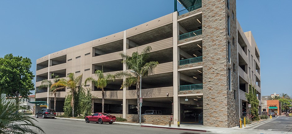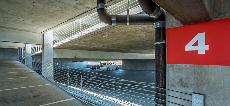 The parking structure consists of a two-bay long span design. This column-free interior design has allowed for striping flexibility. The parking structure has 307 stalls with a double helix ramping system at 5% maximum and two-way circulation for comfort use. It utilizes 90 degree parking at 8’-6” x 18’-0” with 25’-0” drive aisles, and all handicap-accessible stalls are located on the ground level on the south side adjacent to the elevator/ stair core for easy access. Vehicular restraints are in the form of concrete spandrels at perimeter locations and barrier cables at the interior ramp split location. Pedestrian vertical circulation is per via an elevator and two stairways situated on the southeast and southwest locations, with vehicular access located at the northeast and northwest corners of the parking structure.
